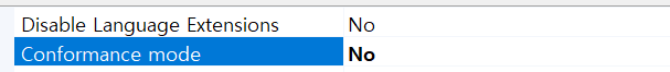 If we change the value Yes (/permissive-) to No, then it will work.